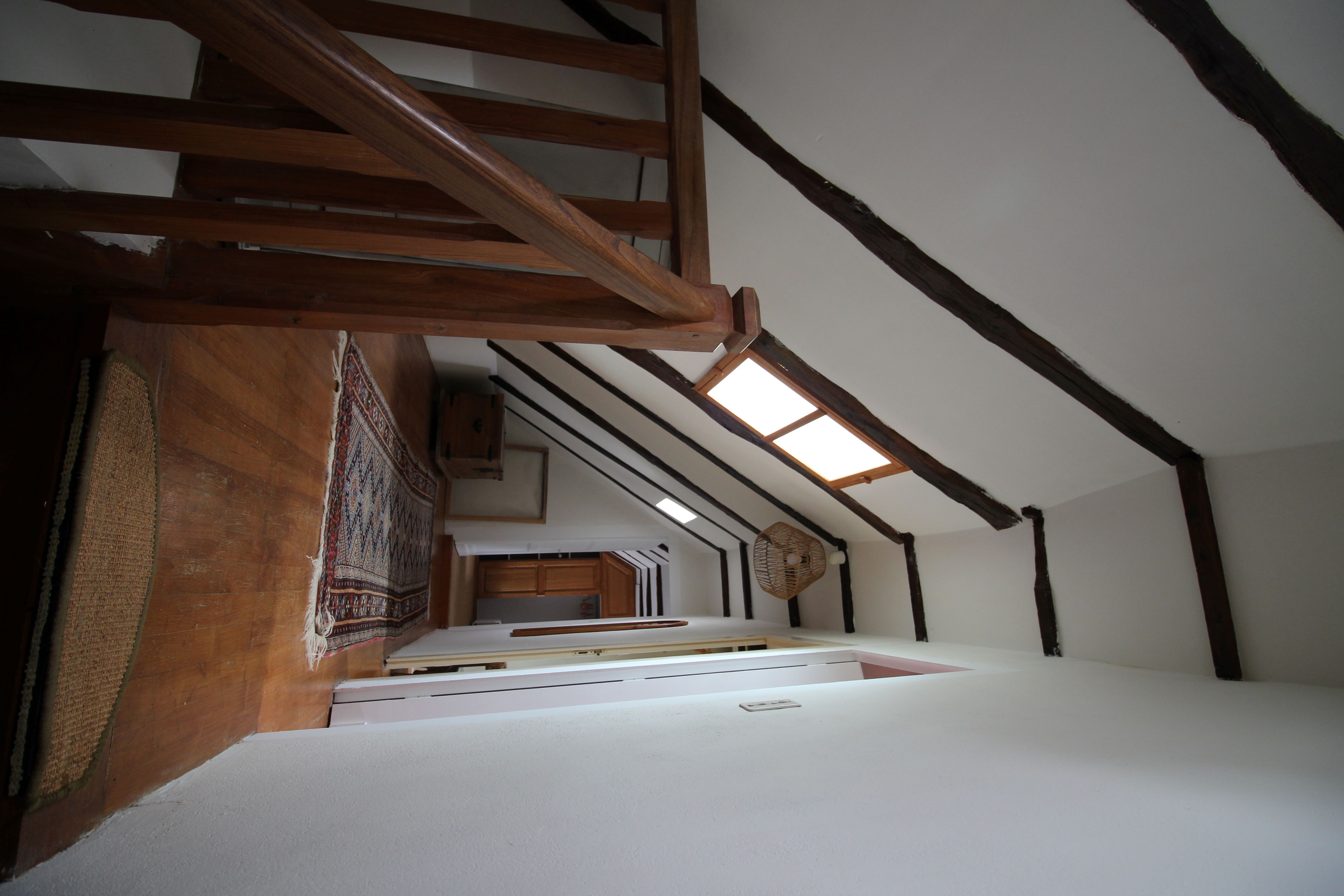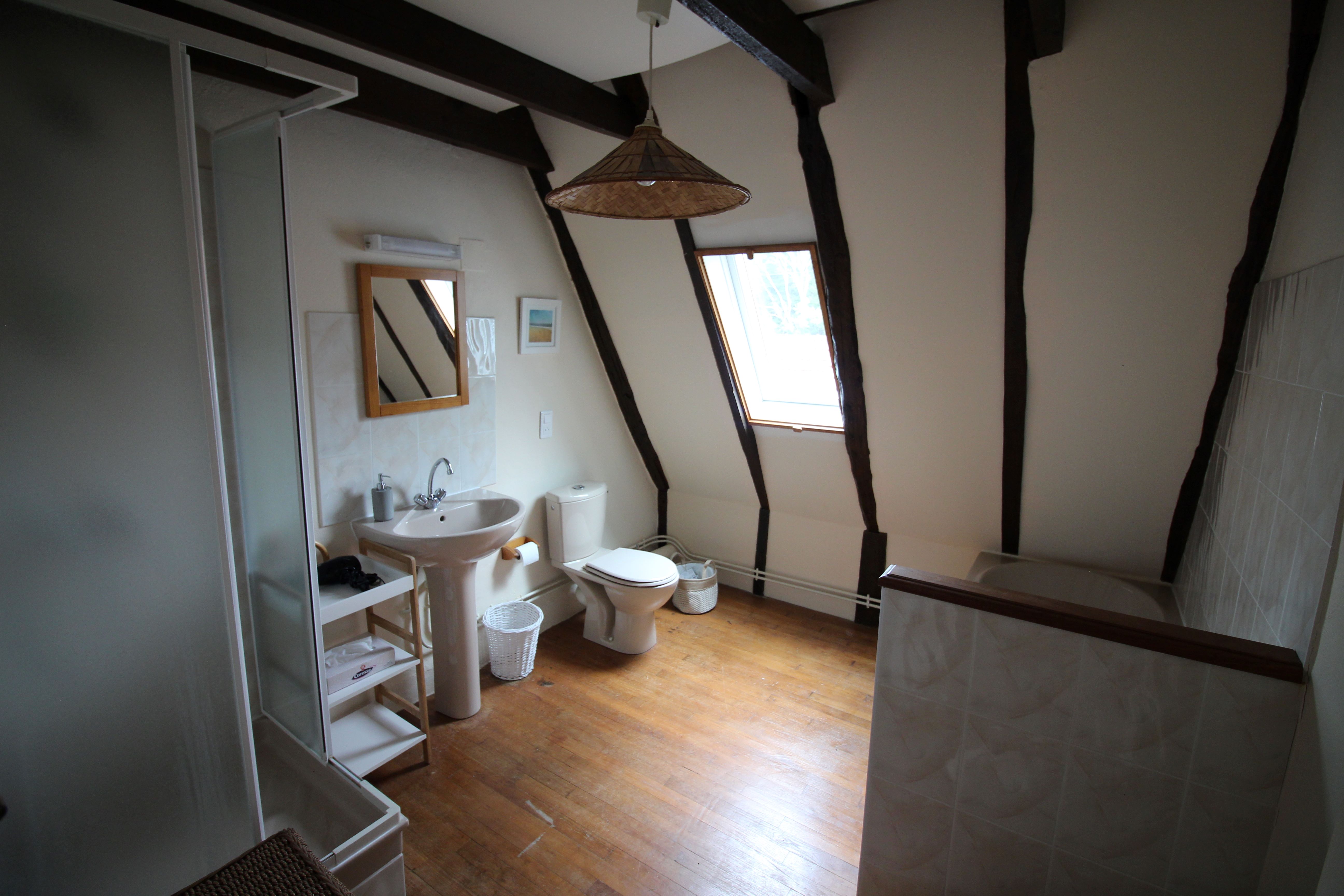 Suite composée de deux chambres : chambre Curry (11m²) en haut des escaliers et chambre Sauge (18m²) au fond du couloir, chacune avec lit queen size. Une salle de bains commune de 8m² avec douche et baignoire, située entre les deux chambres.